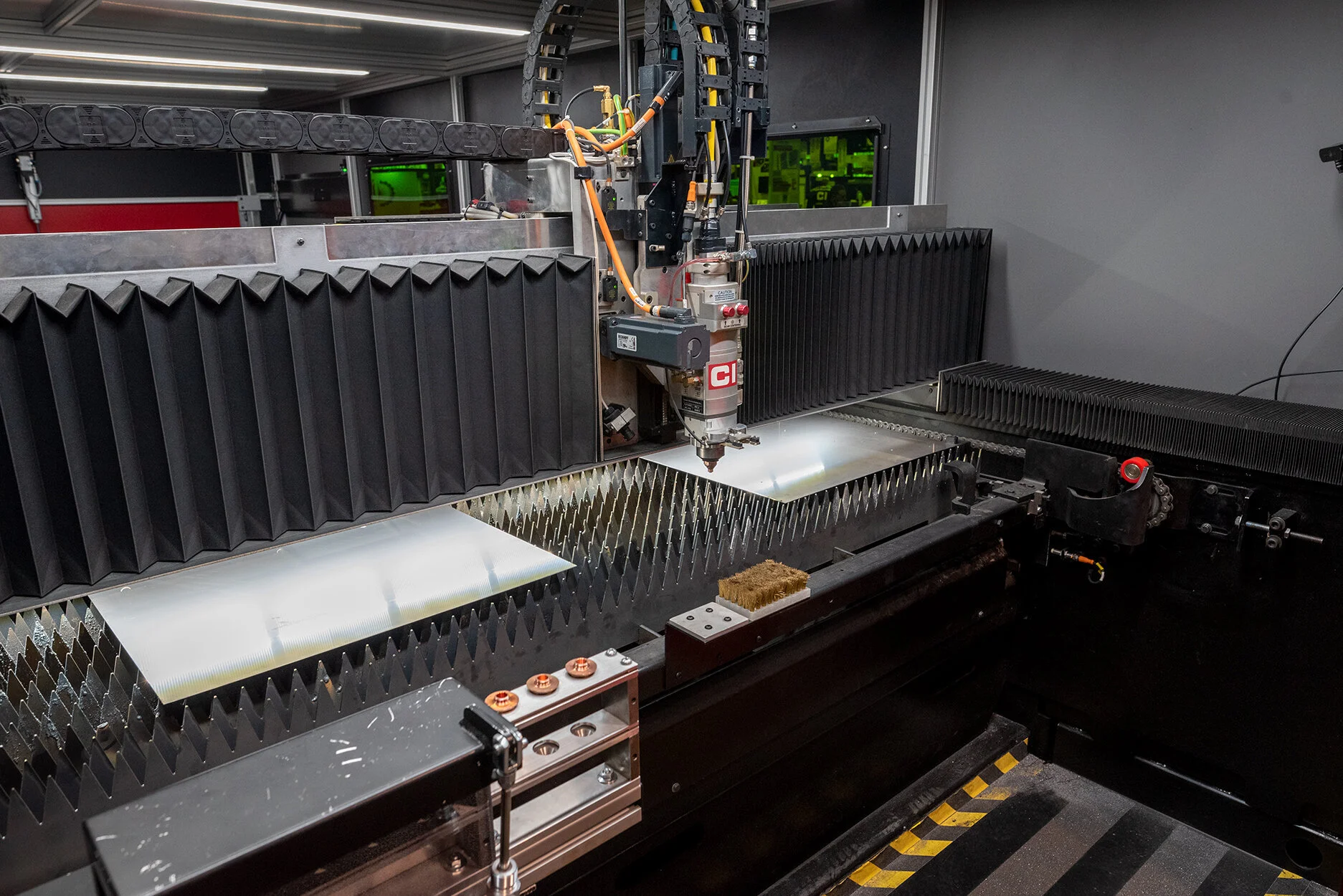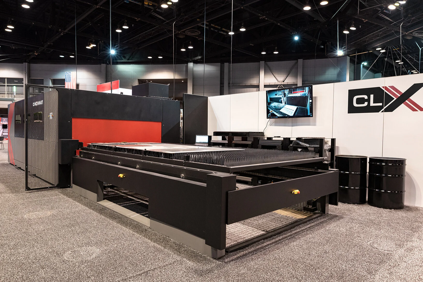 The CLX has the same beefy toughness as its predecessors (it’s a CINCINNATI, after all), but the frame weighs in at half the total weight. That lighter frame comes with a better brain, one that allows the machine to take care of itself, keep things moving and keep cutting material. Dual 24-inch touchscreen monitors allow operators to access machine controls while switching between four interior cameras with different aspect ratios.