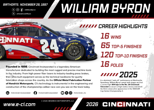 Cincinnati Incorporated is thrilled to announce the expansion of our dynamic partnership with Hendrick Motorsports, the most victorious team in the storied history of NASCAR. This collaboration is entering an exhilarating new phase in 2026, where we proudly become the primary sponsor of William Byron and the illustrious No. 24 NASCAR Cup Series team for two premier races.